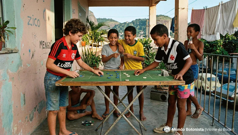 Brincadeiras de rua, soltar pipa, pião, queimada, bola de gude e, logicamente, o nosso futebol de botão, eram a nossa diversão. Acontecia na calçada, na garagem da casa da avó de alguém, embaixo de uma árvore em dias de sol escaldante. Era na rua que a nossa socialização acontecia; ali aprendemos muitos dos nossos valores, resolução de conflitos, lealdade, amizades duradouras. Tudo acontecia em torno da rua. O trânsito era livre para os pré-adolescentes da época, e o futebol de botão estava lá presente, forte, competindo com tudo e todos, inclusive o ancestral dos video games, as mal faladas casas de fliperamas, os pesadelos dos trocos dos pais. Fala a verdade, quem nunca desviou algumas moedas do troco do pão para, no fim de tarde, jogar Pac-Man? E o nosso futebol de botão estava lá, firme e forte; torneios de garagem, de rua, de bairro, tudo acontecia simultaneamente. E por quê? Porque era o ambiente natural dele; era na rua que se aprendia, se trocava times e até se competia.